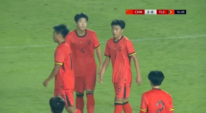万项倒三角助攻, 张旭尧低射破门, 国少两球领先东帝汶 直播吧11月24日讯U17亚洲杯预选赛A组第二轮,中国vs东帝汶。比赛开场第17分钟,万项底线附近倒三角助攻张旭尧,后者低射破门,中国队2-0领先。