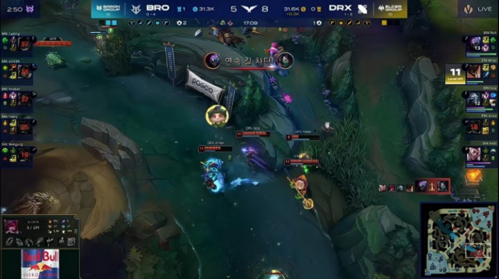 11分钟双方在小龙处爆发团战,阿卡丽成功拿下一血!13分钟双方在下路河道再次遭遇,DRX凭借洛先手开团抓到机会,DRX打出2换3团战!17分钟BRO先手击杀霞后选择继续追击,但是石头人大招撞到四人配合武器进场输出,DRX打出1换5奇迹团战!