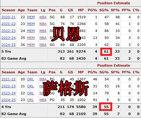 NBA生涯至今萨格斯合计出场5580分钟,其中占比55%打二号位,贝恩合计出场9274分钟、占比61%打二号位。也就是说,二人是直接竞争关系。