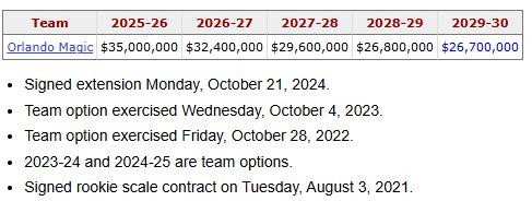 如下图所示,萨格斯和魔术还有5年1.5亿美元大合同。不同于八村塁、博格丹诺维奇这些处于合同年的球员需要时间“刷”数据的球员,在还有5年合同下萨格斯后续有时间来证明自己。