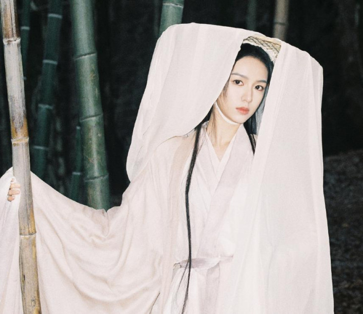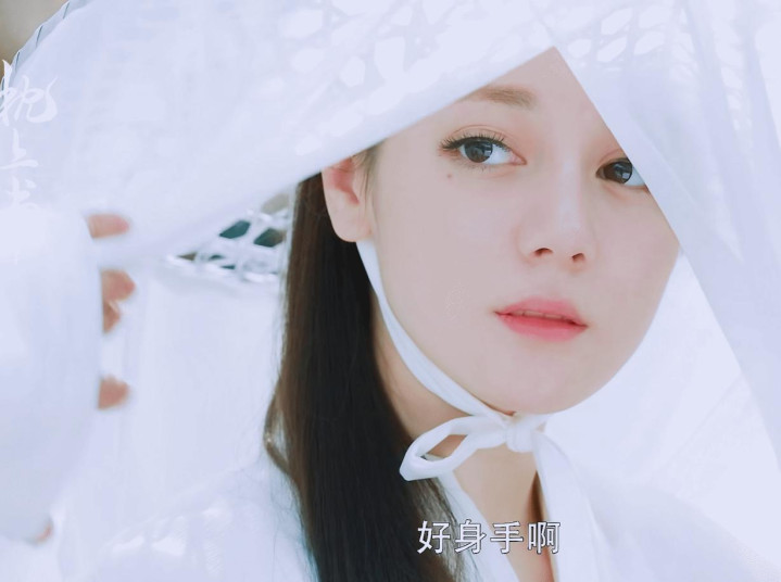 在阿兰若之梦里的白色帽帷造型看起来破碎又唯美,局部露出的五官弱化了浓颜系的冲击力,只有眼下的泪痣格外明显,看起来很有故事感。