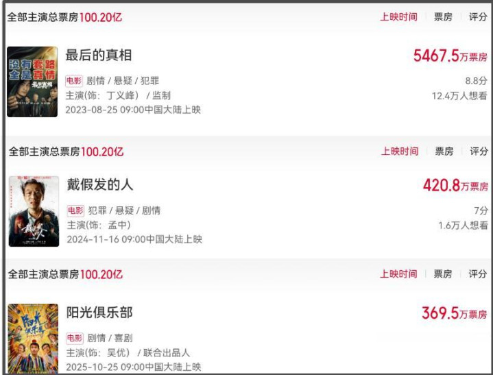 从《最后的真相》5000多万到《戴假发的人》400多万,再到《阳光俱乐部》正在扑街中,黄晓明好久都没有主演商业大片了,不是参演主旋律电影,就是沉迷小众题材,想要靠着折腾自己拿个奖,不过两年时间,他的票房号召力从破亿都难变成了破千万都难。
