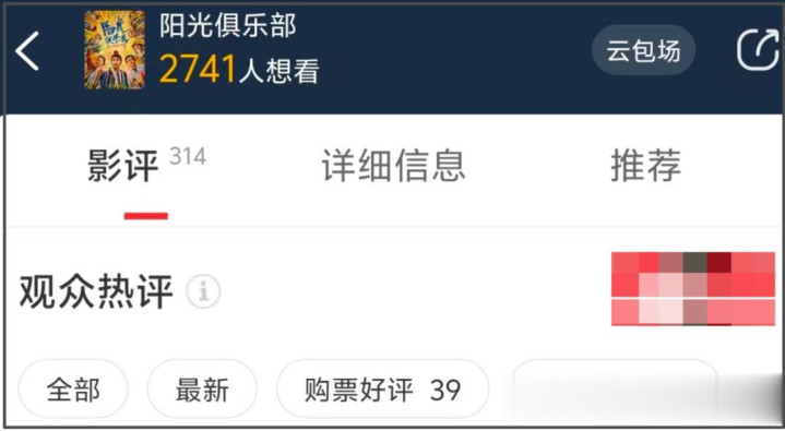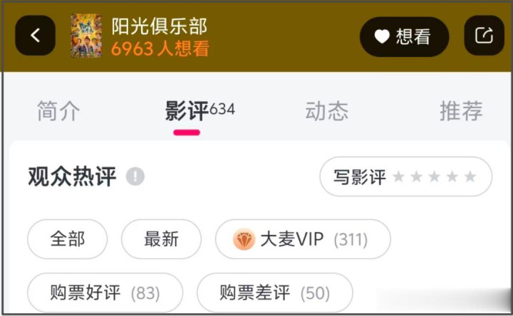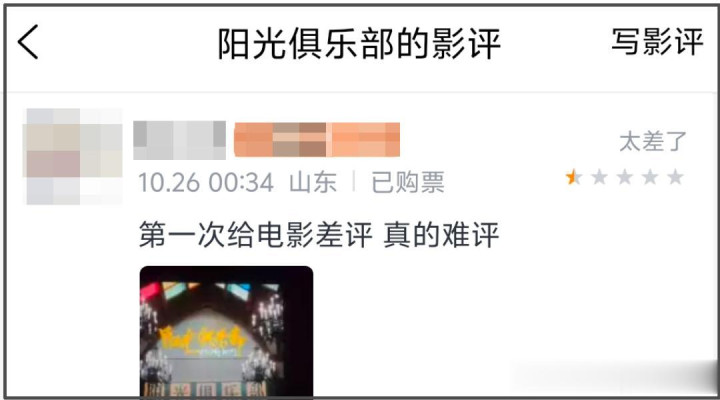比票房表现更糟糕的,还有《阳光俱乐部》的口碑,两大购票平台观影反馈都只有三位数,但差评比都快要一比一了。
