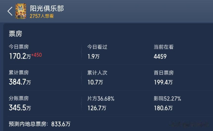 最近电影市场又进入了寒冬期,上映新片票房一个比一个惨淡,黄晓明主演电影《阳光俱乐部》赶在周末上映,日票房勉强突破百万,预测票房连一千万都不到。