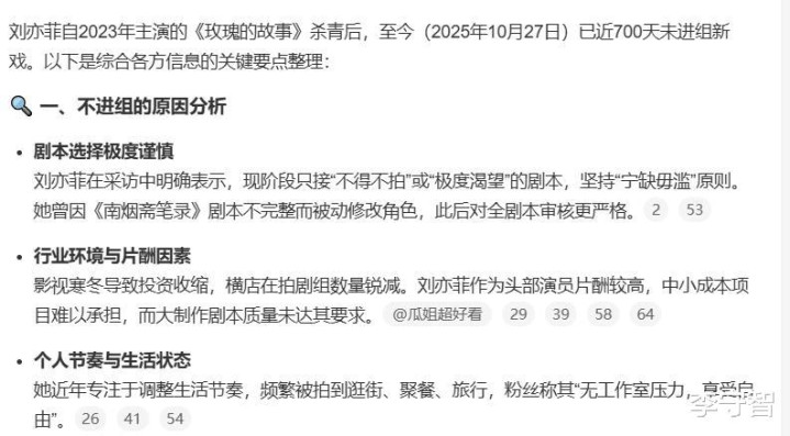 让人有点意外,粉丝估计也很期待。但刘亦菲这边完全不着急,一来她从来都不是劳模,出道走红几十年,作品也不算很多,毕竟都要女一号或者大女主,剧本不好找。特别是前些年专攻电影,但口碑票房一般,所以多年没拍剧,曾经据说还有三年没进组的情况。最近几年重回剧圈,连着拍了《去有风的地方》《梦华录》《玫瑰的故事》,成绩都不错,还有一两部没播出的。只是冲击白玉兰视后失败,估计有点打击积极性。
