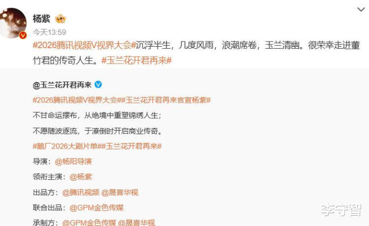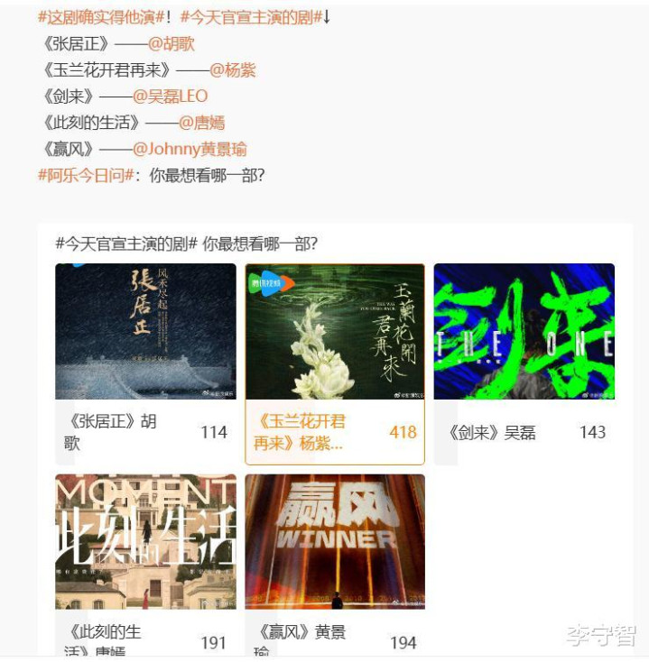 所以影视圈看起来还是很繁华的,时不时有新剧官宣主演阵容,还有开机和定档的消息。但是像最近这样扎堆官宣的情况还不多见,比如2025年10月27日这一天,就有好些明星被新剧官宣,包括但不仅限于:《张居正》——胡歌、《玉兰花开君再来》——杨紫、《剑来》——吴磊、《此刻的生活》——唐嫣、《赢风》——Johnny黄景瑜等等。