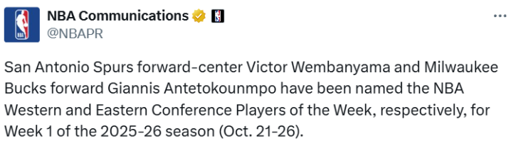 北京时间10月28日,NBA官方公布了新赛季首周的周最佳球员,马刺队中锋文班亚马当选西部周最佳球员,雄鹿队前锋字母哥则斩获东部周最佳球员荣誉。这是文班亚马职业生涯第二次当选周最佳球员,对于字母哥而言,这是他生涯第28次当选周最佳。首周的周最佳竞争激烈 ,东契奇和亚历山大场均40+的表现,仍无缘当选。