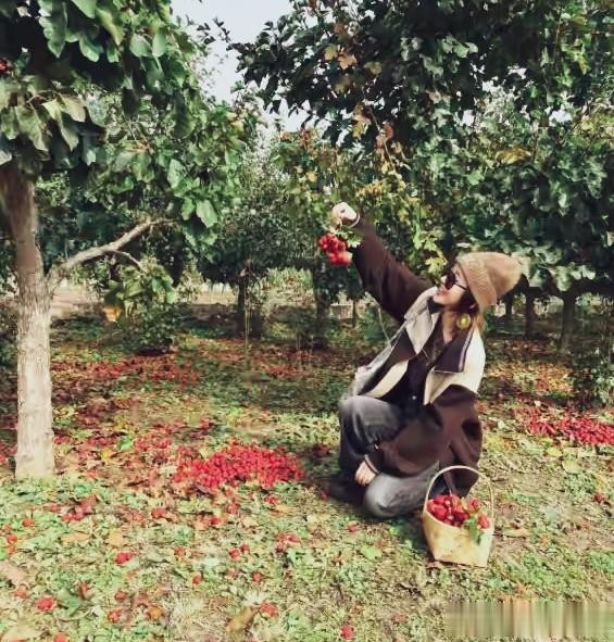 唐艺昕化身田园女神! 徒手摘山楂收获颇丰, 笑容比果子还甜!