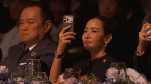 再看看泰国的阿努廷夫妻档,他们看节目的模样倒是挺不一样。阿努廷表情很严肃,也没拿手机,而他老婆就在旁边拿着手机拍照,挺高调的。其实阿努廷的面部管理挺对的,别忘了这次来韩国,他手臂上还绑着孝布。现如今泰国连普通人都穿着黑衣素衣,很多演出都暂停了,所以阿努廷看晚宴表演也不能太开心。
