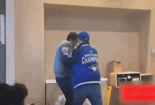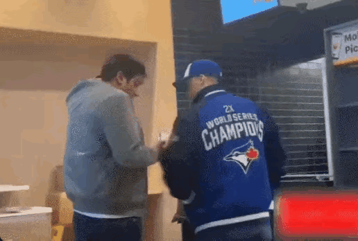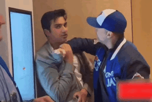 突然,一个身穿多伦多蓝鸟队夹克戴着蓝鸟队帽子的强壮的白人男子走向一个正在取餐区看手机的印度男子。