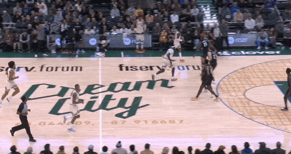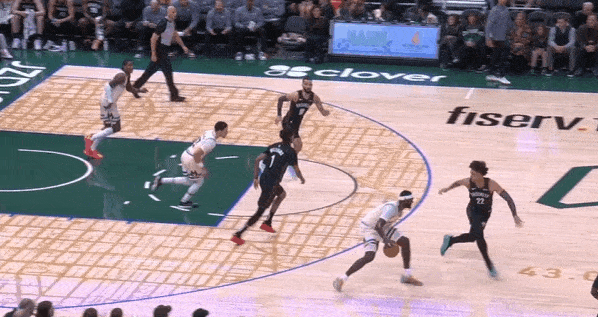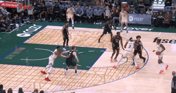 上前刷卡抢断克劳尼后持球推动反击,克劳尼被抢断后还不及时回防,波特、字母前场2打1,波特吸引曼恩防守注意力后立即回给跟进的字母。