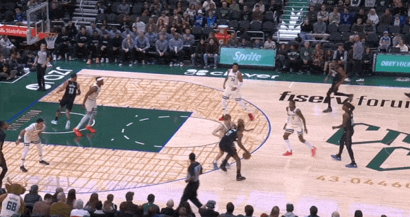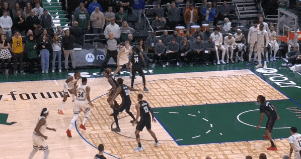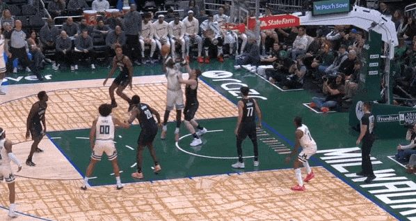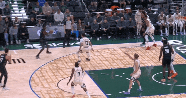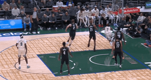 篮网全场紧逼施压,波特空手移动摆脱防守人后奔向前场接波蒂斯上球,接球后直杀篮下吸引赵四防守注意力后为字母送上空接,助其隔扣赵四。