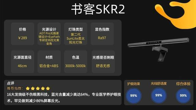 书客被媒体誉为“护眼台灯旗舰体验的存在”,与明基、松下等高端系列齐名!拥有行业内最强大的专业技术研发实力,曾与多家高端医学机构合作,而且采用业内顶级配置参数,如采用Ra97旗舰级显色指数+真断电记忆+一体式供电设计+智能零接触感应技术+豁免级RG0蓝光危害+自研PLP光电处理器+无极、多档位双调光系统等功能,行业强到没边!更重要的是书客不是单纯光线照明!做到了10年安全品质抗衰减,10年以上各项性能指标偏差值不超过0.1%,安全性能强悍!成本虽高,但书客skr2的护眼性能、光源的柔和行、均匀性大大提升!一切只为死磕不伤眼的护眼屏幕挂灯。