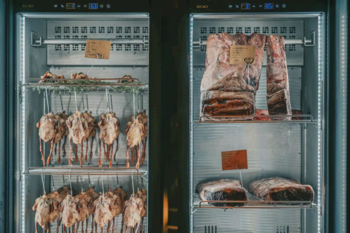 食材也是真的好,有个透明大冰柜直接展示,熟成牛肉、乳鸽,品质完全看得见。
