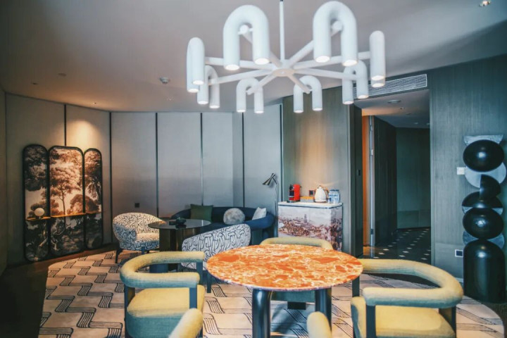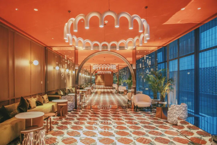 酒店整体以柔软又鲜活的石榴红为主色调,源自落日余晖落入运河中,染红一片水光的浪漫色彩。