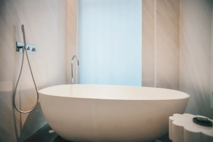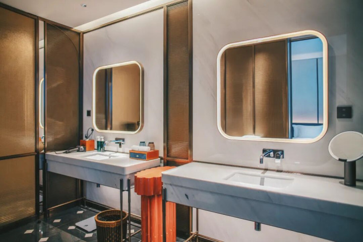 房间的整体配置也会更好一些,有浴缸,洗漱区还配了双台盆。